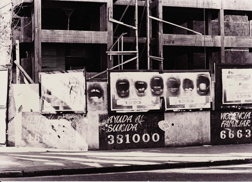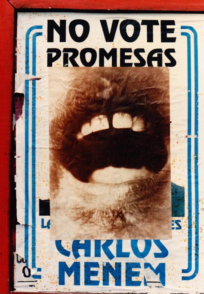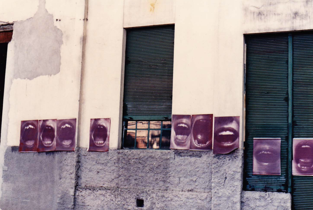 Con algunas excepciones, los motivos más recurrentes en las piezas elaboradas por Graciela Sacco reiteran registros fotográficos de bocas, protestas y ojos. Desde 1993, Sacco ha realizado diferentes versiones de instalaciones e interferencias (como la autora prefiere denominar sus intervenciones al espacio público) por medio de una colección de imágenes compuestas por fotografías que reproducen el mismo encuadre: una boca abierta que muestra los dientes y la lengua. De manera semejante, a partir de 2001, la artista ha usado un encuadre fotográfico recurrente para inscribir planos de ojos en diferentes contextos y superficies. Por último, desde 1996, la apropiación de imágenes de protesta ha sido recurrente en la trayectoria de esta artista, un proceso en el que ha procurado su transferencia a diferentes soportes que procuran su espacialización. Graciela Sacco ha usado esas fuentes de múltiples maneras y ha vuelto a usarlas de acuerdo con diversos contextos creativos; tal como lo señala Andrea Giunta (2000), así como “unas veces ocupa la calle con sus imágenes imprecisas, a fin de interceptar la retórica publicitaria, con una lógica semejante introduce en el espacio de las confrontaciones consagratorias —el museo— un repertorio estrechamente ligado a la protesta urbana y callejera”.