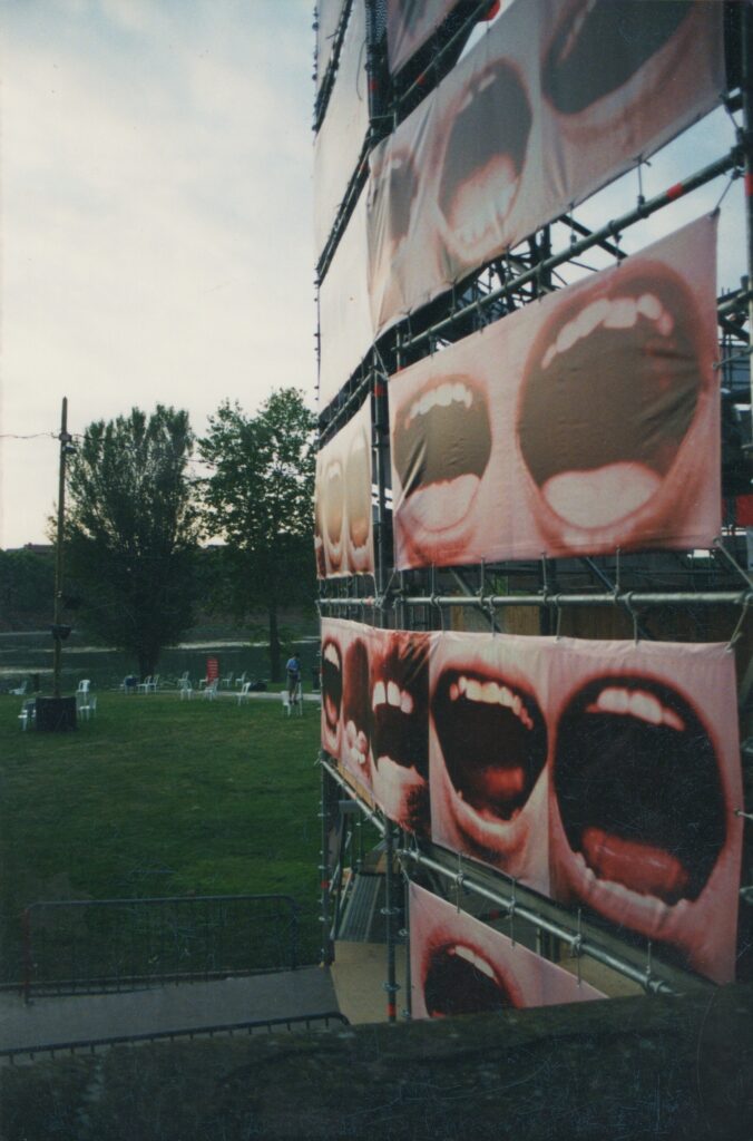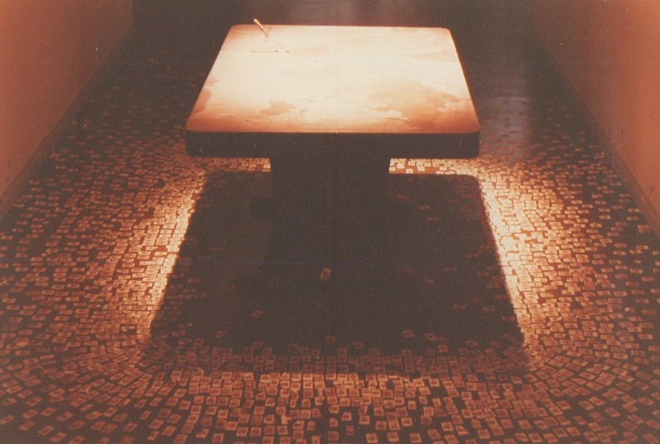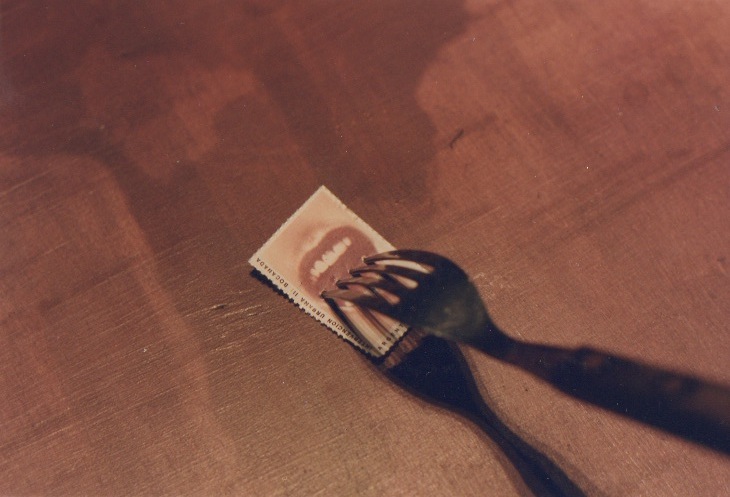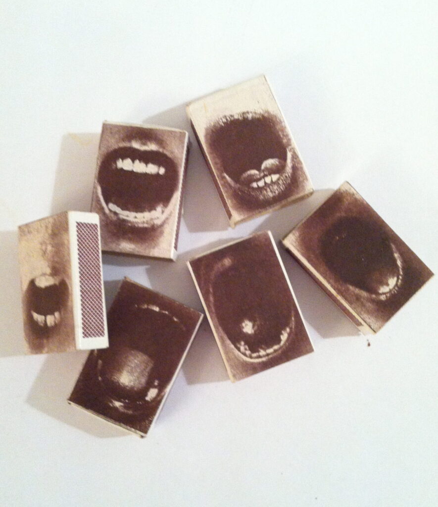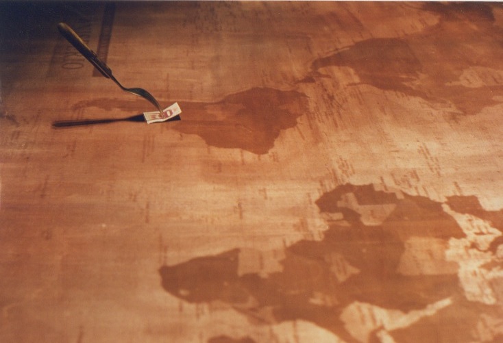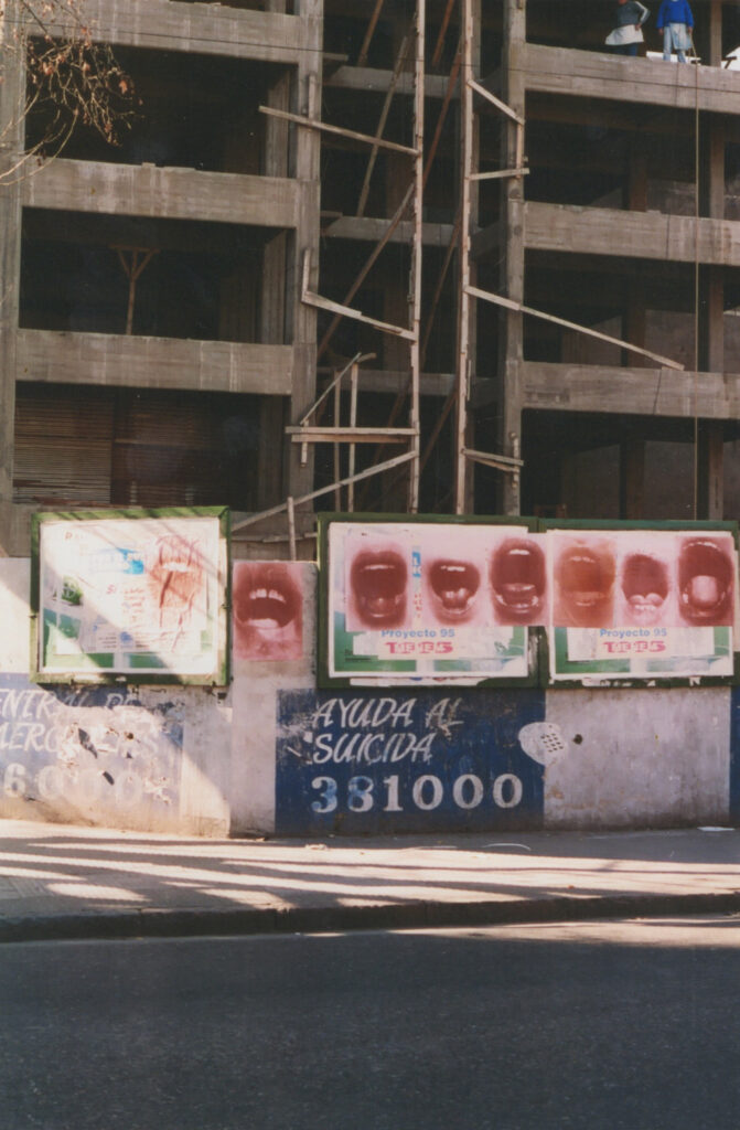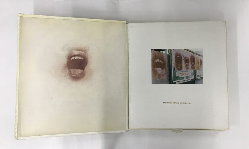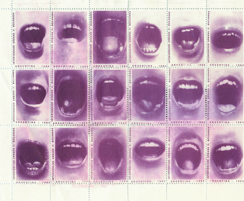 Otra versión de la obra es una instalación conformada por una mesa de madera, cuya superficie presenta un mapamundi impreso en heliografía, que soporta una estampilla con una boca impresa atravesada por los dientes de un tenedor, mientras en el piso se observa una suerte de superficie compuesta por cientos de estampillas con imágenes de bocas. Para poder observar la mesa y lo que sobre ella reposa, el público se ve obligado a pisar las bocas del piso, con lo cual la obra propone una experiencia que remite a la indolencia general frente a la problemática de la hambruna en el mundo. En otra traslación de las mismas matrices, son cajas de fósforos las que soportan estas imágenes en su cara superior, mientras en una de las superficies laterales se lee la sentencia: “una chispa basta para incendiar la pradera”, que sugiere la posible repercusión de grandes dimensiones que late en cualquier acción aislada y mínima (Giunta, 2000). Otra presentación para recintos cerrados exhibe las nueve bocas de los carteles en impresiones heliográficas a manera de exhibición de originales, con lo que explota todo el potencial visual e indicial de la imagen fotográfica.