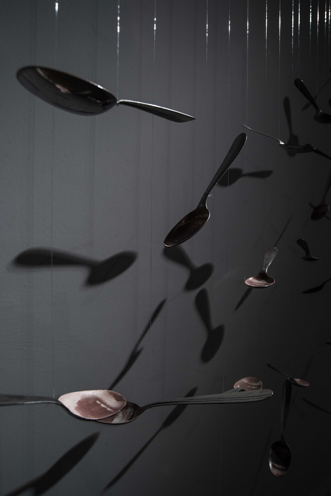Por ejemplo, la primera versión de Bocanada (1993/2014) consistió en un repertorio de carteles impresos donde cada uno estaba ocupado con el plano de una boca abierta, sin mayor información, y dispuestos sobre muros del espacio público que, colocados en época electoral, generaban lecturas que articulaban, complementaban o contradecían la información asertiva de la publicidad política con la que eventualmente compartían las superficies donde fueron adheridos. De alguna manera, con este gesto de inserción visual en lo urbano, su obra competía con el espacio dominado por el establecimiento en sus múltiples manifestaciones: propaganda política y publicidad de carácter público o privado (Aguzzi, 1998). Desde entonces, la artista ha realizado versiones semejantes en diferentes ciudades, pero Bocanada también ha contado con una multiplicidad de variaciones dispuestas en salas y recintos museales, operación en la que Sacco ha contado con la versatilidad que permite la transferencia de las matrices fotográficas a diferentes soportes y materiales que connotan el significado de la imagen, otrora aislada y completamente autónoma. Una instalación conformada por sesenta cucharas, cuyas cabezas se han fotosensibilizado para imprimir reducciones de las matrices, cuelgan del techo y la imagen de las bocas adquiere un mensaje más explícito al asociarse con el objeto que las soporta: el hambre. A su vez, no deja de ser llamativo que la imagen general de la instalación cobre otro sentido luego de las manifestaciones y cacerolazos que se produjeron luego de la crisis económica que sufrió Argentina en 2001, como si esta y otras obras de Sacco anticiparan los acontecimientos históricos vividos en este país y otros lugares del mundo, y materializaran la latencia de una indignación colectiva que creíamos había caducado o pertenecía a otros tiempos.