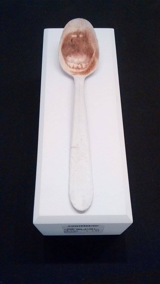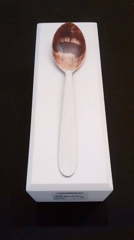 Impresión heliografíica sobre cuchara en pedestal de madera y etiqueta