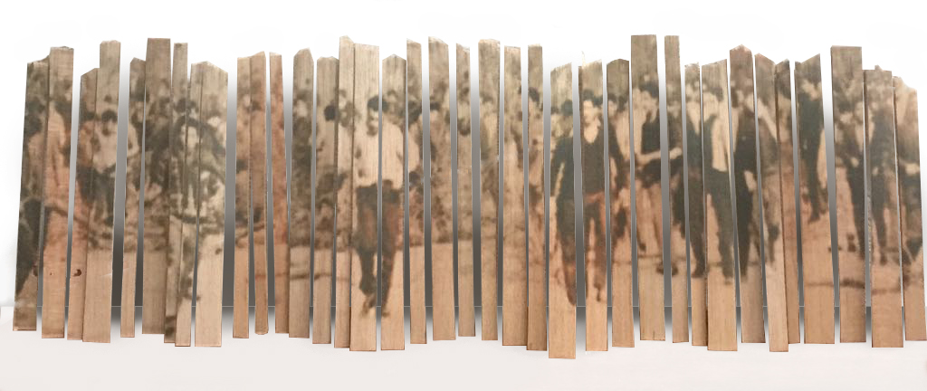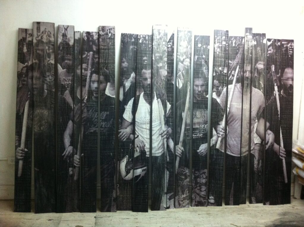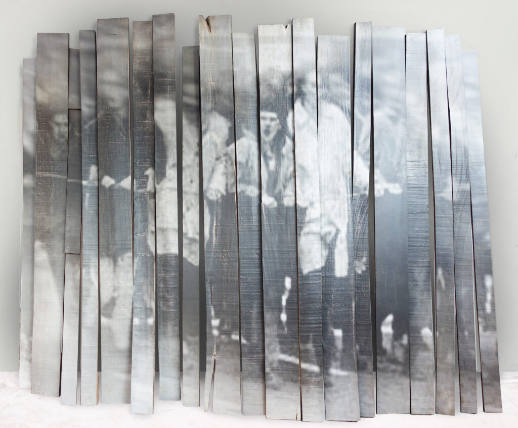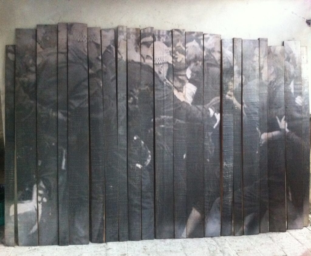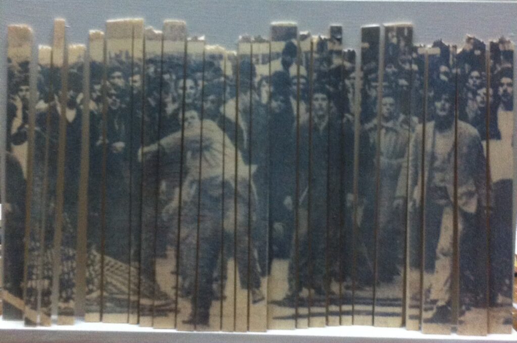 Sin embargo, la relación que Sacco establece con las imágenes es diferente, pues algunas de sus estrategias creativas, como apropiar imágenes de prensa o de dominio público y ponerlas nuevamente a circular sin hacer explícito el contexto original y los créditos de sus fuentes, generan preguntas sobre la vigencia de la noción de autoría en medio de una sociedad dominada por los medios de comunicación (Garavelli, 2002), de modo que el valor “documental” de la imagen de origen fotográfico (su especificidad contextual), que resultaba fundamental en el uso de fotografías para los antecedentes señalados atrás (Taller 4 Rojo y Tucumán Arde), es parcialmente desplazado. A diferencia de lo sucedido en el proceso de Tucumán Arde, Graciela Sacco no se interesa por componer un gran fondo documental de fuentes visuales que sirvan para registrar el transcurso de una situación particular; más bien, su uso de imágenes con origen fotográfico se limita a un pequeño conjunto de motivos reiterados en distintos formatos y materiales para componer diversas piezas, articuladas por la transferencia fotográfica de estas imágenes a otras superficies y dispuestas en salas o espacios públicos, donde, ante todo, procuran confrontar la experiencia del espectador.