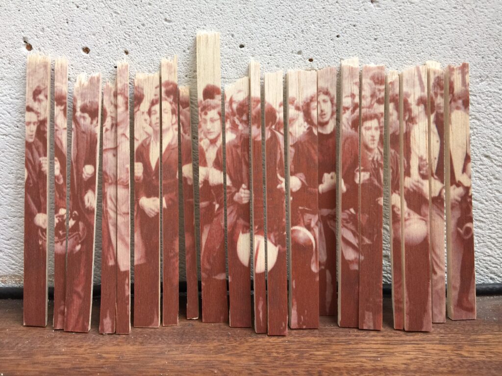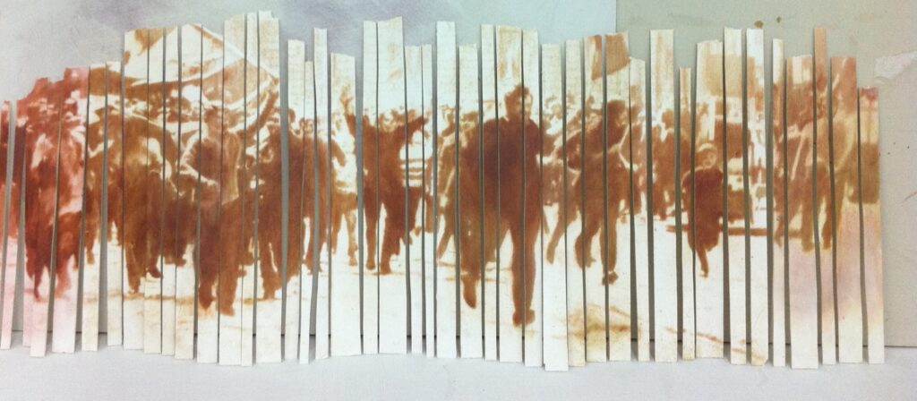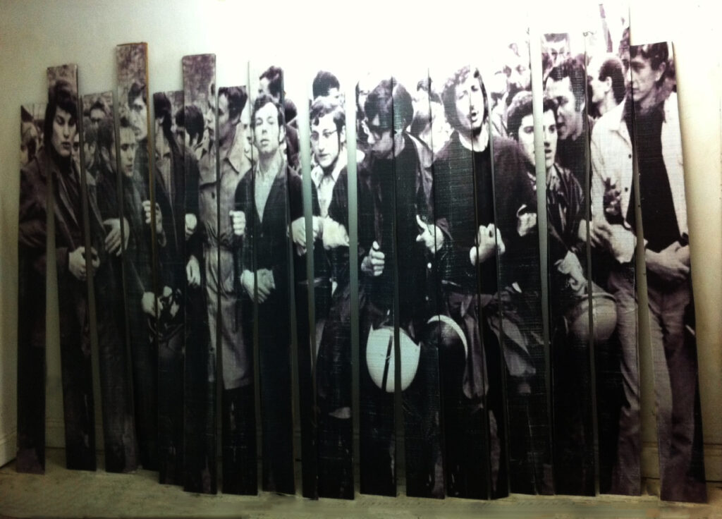 Al descontextualizar las fotografías, Graciela Sacco desplaza el carácter testimonial e histórico que les dio origen, y solo nos queda su vestigio, su ausencia existencial. Lo que miramos, las personas, el lugar o la protesta no están ahí, pero aun así su fantasma —su huella lumínica— nos interpela y propicia la aparición de otros personajes y protagonistas en otros escenarios y momentos de coyuntura, imágenes que la memoria de cada receptor activa: quizá el Bogotazo allí, la Primavera Árabe allá, etc. La estrategia creativa de Sacco reside ahí, en el juego de expectaciones inmanente a la fotografía: lo imaginario y el deseo, aquello que nace de esa tensión, y de la distancia entre lo visible y lo intocable que nos ofrece la fotografía (Dubois, 1986, p. 69). De ahí lo imperativo que resulta para la artista rosarina reproducir aquellas imágenes una y otra vez, manipulando diferentes soportes que connotan y exacerban sus múltiples y potenciales significados y apelando a diferentes escenarios, afuera y adentro del museo, pues nunca se sabe dónde pueda surgir o brotar aquel destello.