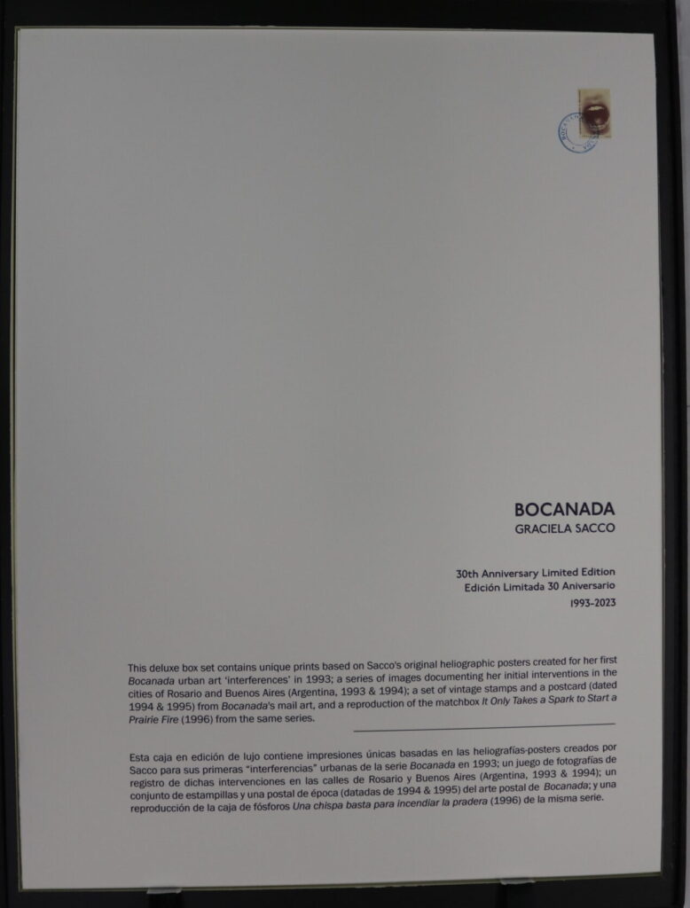 Graciela Sacco ha realizado intervenciones de Bocanada en ciudades de todo el mundo tales como Buenos Aires, Sao Paulo o Nueva York. Ella ha colocado imágenes de forma ilegal en edificios, muros y empalizadas en cada una de esas ciudades, trabajando con frecuencia durante las campañas electorales. Provocativas y desarmadas, estas bocas abiertas parecen invadir el paisaje urbano, interfiriendo los mensajes de los carteles de campañas políticas y otras formas de propaganda. Comunicando sentimientos tales como el miedo, la indignación o shock, estas imágenes tienen fuerte significado político y social. Para la artista, estas imágenes refieren a los problemas del hambre y la hambruna, pero también de forma más general a las expresiones de la apremiante necesidad o incapacidad de comunicar pensamientos o deseos.