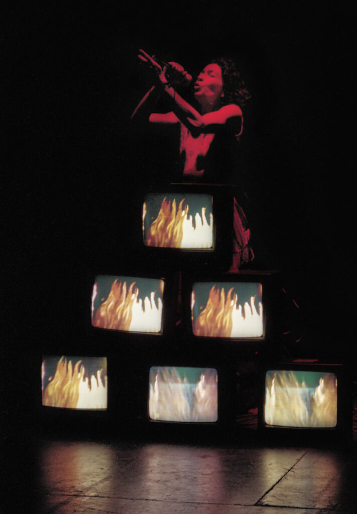 El trabajo se completa a través del propio cuerpo de Hincapié. Tal como describe la curadora Andrea Giunta: “El video y las fotografías de la performance Intempestivas nos muestran a María Teresa Hincapié en una forma de ceremonia ritual extrema que convoca referencias a la violencia en Colombia en las que se cruzan citas míticas, religiosas. El guión del video es de José Alejandro Restrepo, pero María Teresa inscribe en la performance una dimensión sacrificial irreemplazable. La redefinición del cuerpo que se pliega y activa desde la forma involucra una performance que explora los límites del espacio. Un espacio en el que ella se desplaza entre televisores, canta, extiende su cuerpo al ritmo del rezo bajo el foco. Todo sucede en un escenario.” (Andrea Giunta, Notas de la exposición Pensar todo de nuevo, 2020)