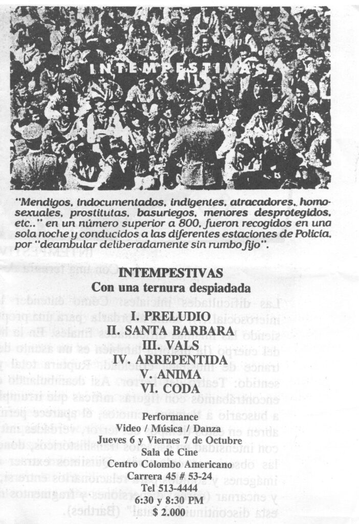 Intempestivas. Videoacción concebida por José Alejandro Restrepo para ser interpretada por María Teresa Hincapié con música de Santiago Zuluaga. Se trata de uno los primeros ejercicios experimentales de video y performance de larga duración en Colombia, guiada por conceptos de no representación, además de la noción de tiempo expandido como presencia completa, que guiará el trabajo posterior de ambos artistas.
