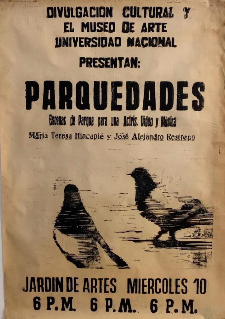 En 1987, José Alejandro Restrepo creó Parquedades, una video-performance para ser interpretada por María Teresa Hincapié. Se trata de un trabajo decisivo para los dos artistas por ser una de las obras tempranas de la carrera de Restrepo, y la obra por la que, por primera vez, Hincapié obtiene reconocimiento en el universo de las artes visuales.