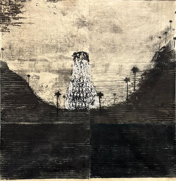 Fotografía blanco y negro intervenida con xilografía