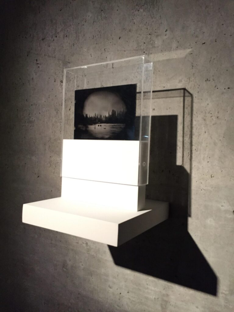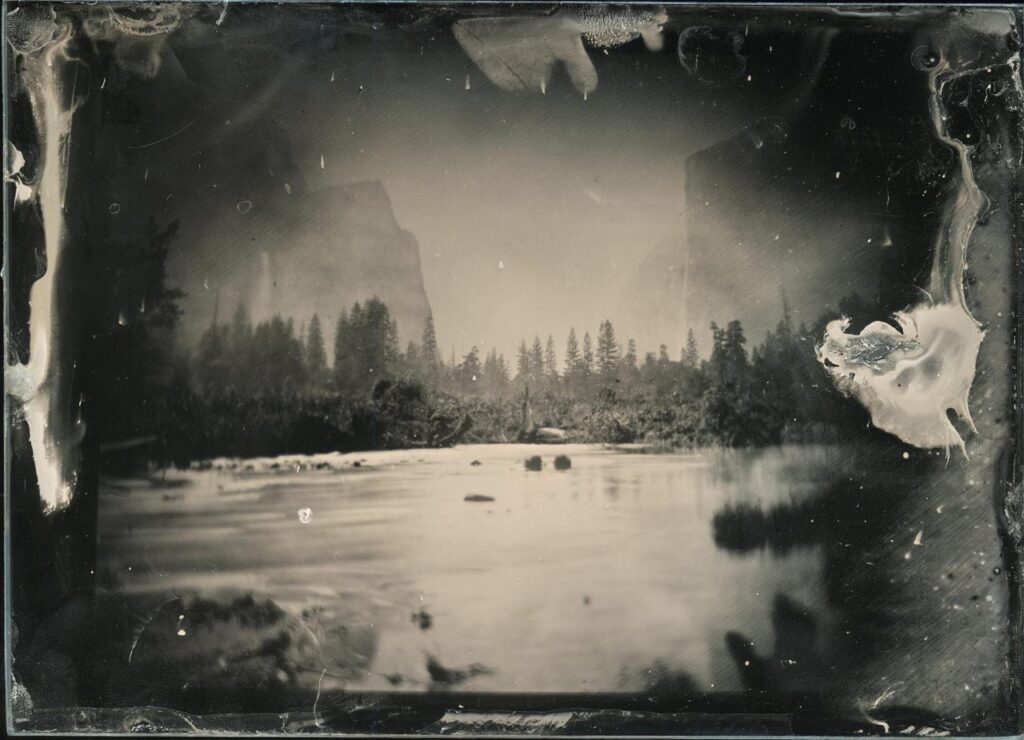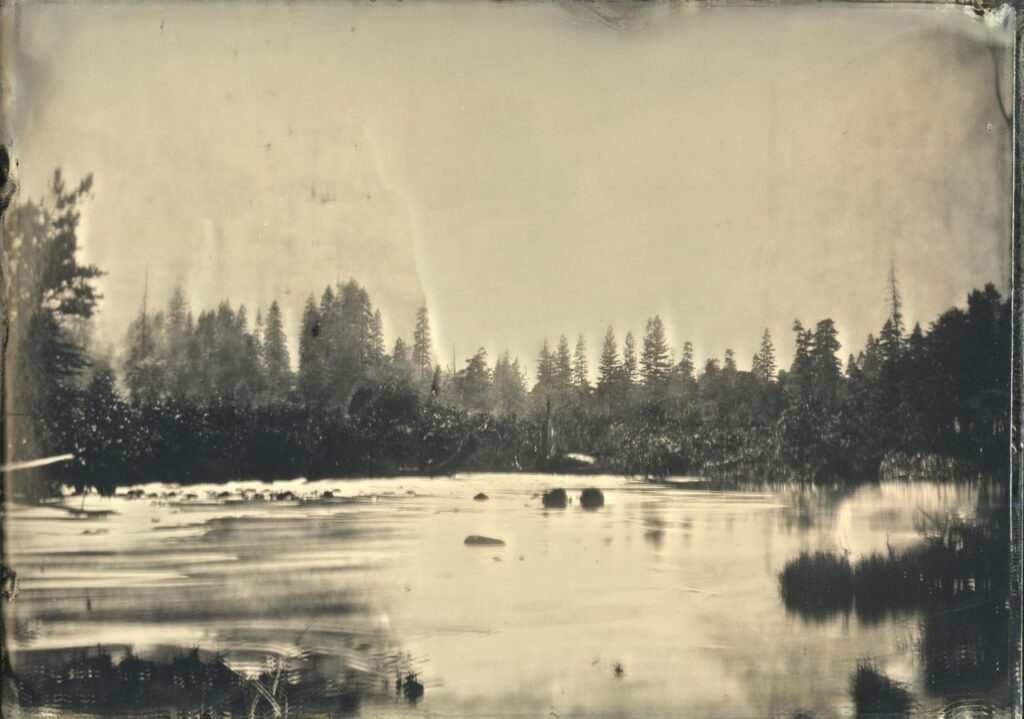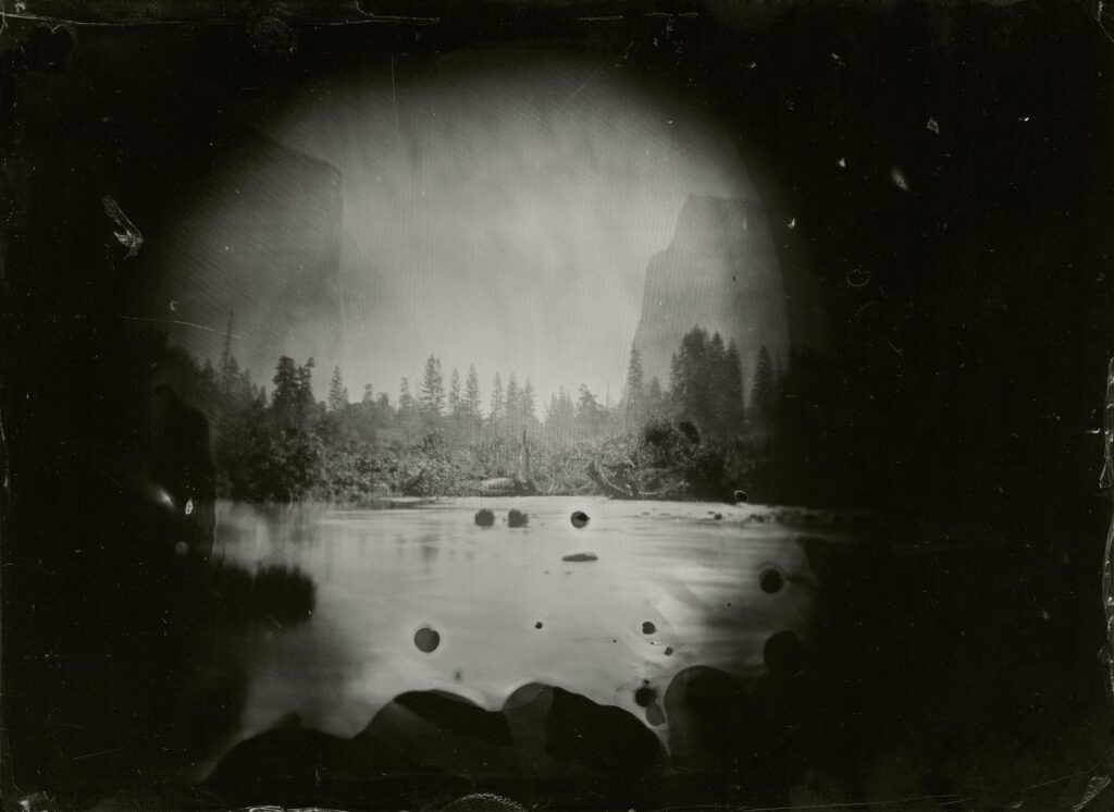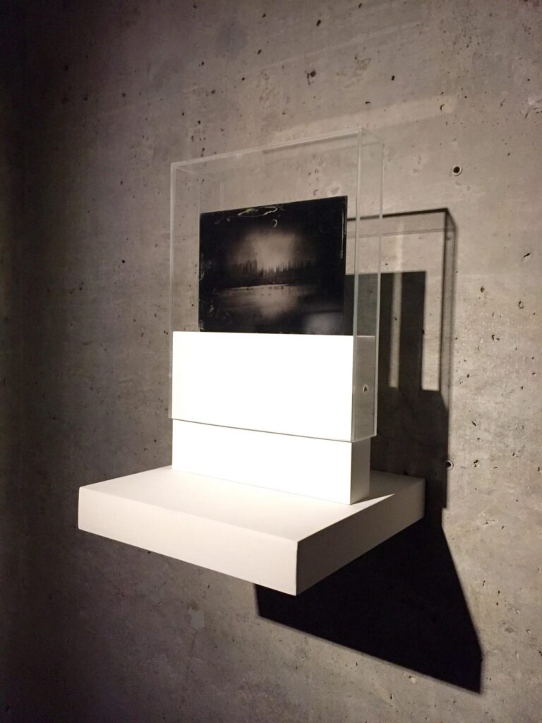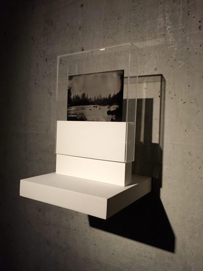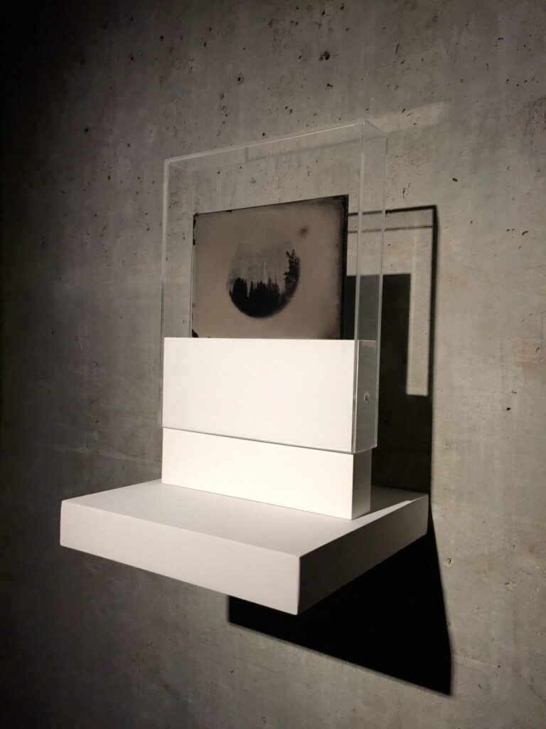Colodión húmedo sobre placa de vidrio en estructura de madera y acrílico.
