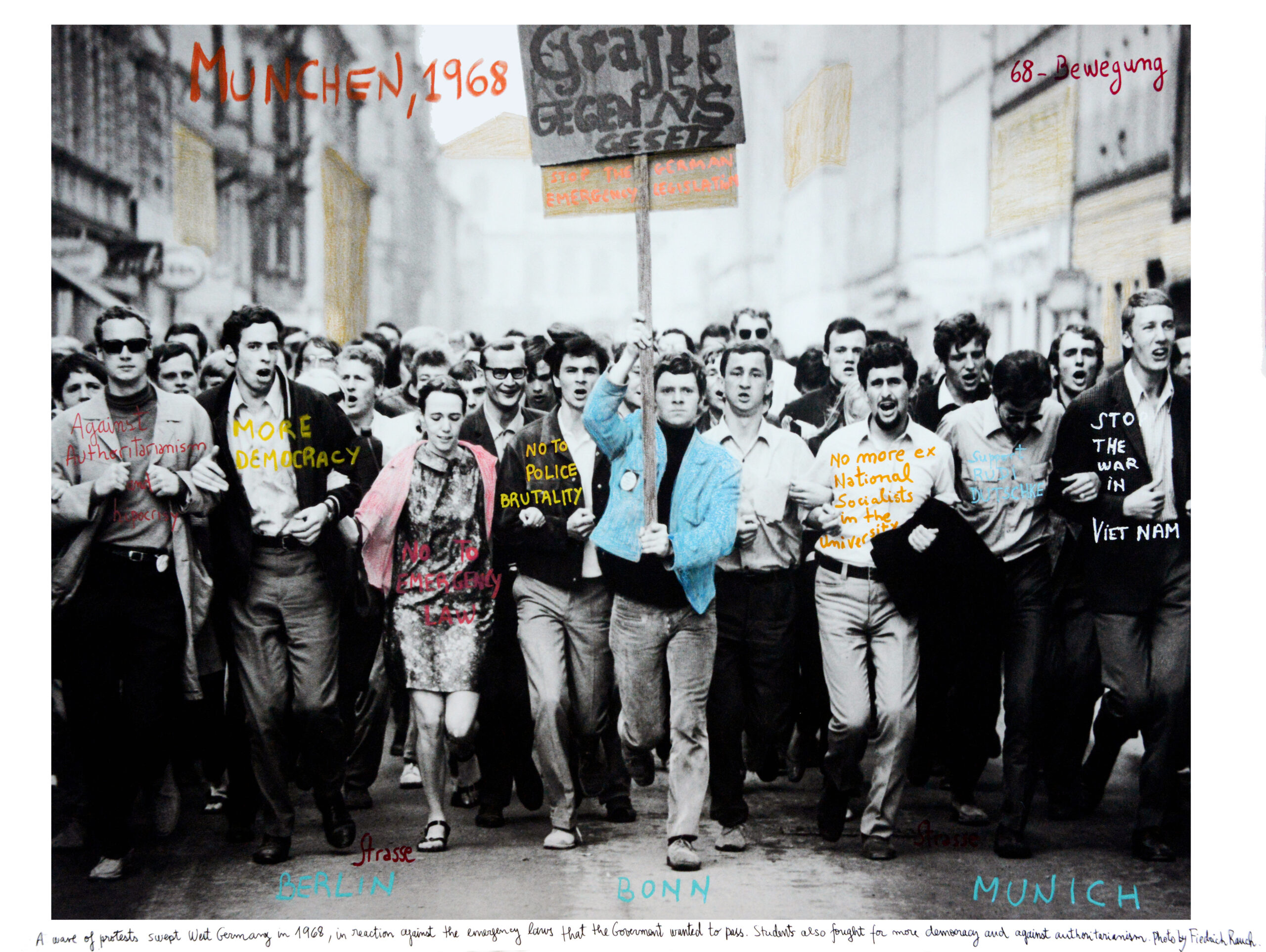 Marcelo Brodsky, artista y activista de los derechos humanos, trabaja a partir de imágenes y documentos de eventos específicos para investigar problemáticas sociales, políticas e históricas mas amplias. A través de su obra busca concientizar a los espectadores sobre momentos históricos, algunos de los cuales lo forjaron, a él a su familia así como a muchos de sus amigos. Más específicamente, y como muchos de los de su generación en Argentina, Brodsky fue perseguido durante la dictadura militar, que durante siete años de reinado del terror, fue responsable de la tortura y muerte de entre 10.000 y 30.000 argentinos, incluyendo al hermano menor del artista, Fernando. Brodsky logra escapar de esa situación y vive en el exilio hasta que la dictadura finaliza en el año 1983. Aunque las experiencias personales instigan y dan forma a sus impulsos artísticos, concientizar y educar a las audiencias con la esperanza de prevenir a otros de tal terror es una de sus más fuertes motivaciones. Para hacer que los momentos elegidos y sus consecuencias sean accesibles al espectador, Brodsky aborda el medio fotográfico desde múltiples entradas. Constantemente su obra da cuenta de un profundo entendimiento del potencial poder de las fotografías, tanto algunas de ellas al momento de su creación como registros de noticas, como otras provenientes de subsecuentes publicaciones y memorias. Por décadas, Brodsky fue dueño y director de una importante agencia de fotografías en Latinoamérica. Su éxito radicó parte en su conciencia sobre qué fotografías atraerían a un mayor público internacional, y parte porque comprendió cómo utilizar secuencias de imágenes en que la percepción de una simple imagen podía cambiar al ser emparentada o secuenciada junto a otras. También entendió cómo orquestar a los textos con las imágenes de manera de dirigir la percepción de los espectadores incluso cuando las palabras parecieran ser aparentemente neutrales. Apasionado y determinado, Brodsky no tiene intenciones de ser neutral. (…) En “1968: el fuego de las ideas” Brodsky presenta las moviizaciones estudiantiles y relaciona eventos sucedidos en Argentina con la turbulencia social en todo el mundo a finales de los años sesenta. Los manifestantes estadounidenses que participaron de la Marcha de los Pobres en Washington liderada por Martin Luther King unos meses antes de su asesinato; los manifestantes en Londres en contra de la Guerra de Vietnam; en Bogotá, México, Córdoba, Río de Janeiro y San Pablo, trabajadores y estudiantes haciendo campaña juntos, en contra de los regímenes militares y otros tipos de estructuras de gobierno. Se los muestra con brazos estrechados, con banderas ondulantes y pancartas, ejerciendo una acción urbana masiva para reclamar por sus demandas. Las obras también incluyen extractos de discursos de Martin Luther King, el Che Guevara, Daniel Cohn Bendit, Herbert Marcuse y Agustín Tosco, cuyas ideas y acciones nutrieron a muchos de los manifestantes. En una pancarta de la manifestación del Mayo Francés de 1968 se muestra, el grito de “L’imagination au pouvoir” (la imaginación al poder). Más que un llamado a “decir la verdad al poder” que sonaba en otras manifestaciones de la época, los parisinos pedían por el fin de todos los límites, incluso en la imaginación. Brodsky es pragmático y directo. No pretende liberar la imaginación de toda restricción, sino potenciar su uso contra el poder corrupto y brutal. Tanto si nos invita a aprender, y a no olvidar jamás las atrocidades del pasado, a honrar a los líderes justos o, como en su más reciente campaña, a mantener la presión sobre las autoridades para resolver y enjuiciar a los responsables de los más recientes asesinatos en masa, aún impunes. Anne Tucker